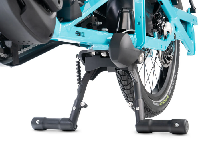 Robust, locking dual-leg kickstand with remote unlock and integrated foot extensions for maximum loading stability