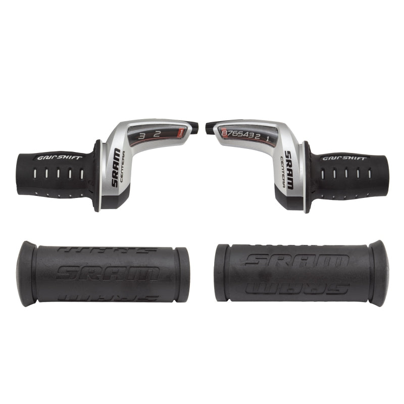 SRAM Centera 8 x 3 Speed Twist Shifter Set. Affordable shifters with the time-tested GripShift design and construction. Compatible with Shimano rear derailleurs designed for 9 or fewer cogs.