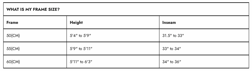 A good place to start is using the sizing charts included for each bike on the info page. If you're in the middle of the recommended height range for a specific size then usually that's the correct one to go with. If you find yourself overlapping sizes at either the top or bottom of the height recommendation than sizing up or down could be a consideration.