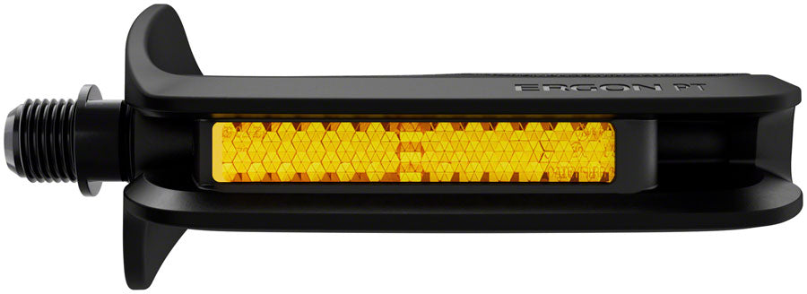 Ergon PT Pedals - Small. The PT pedal is packed with many ergonomic highlights for the demanding Touring rider. The optimized bio mechanics prevents discomfort when pedaling reduces fatigue and provides long-distance comfort even with everyday shoes. The comfort effect extends over the entire leg axis all the way to the back. Thanks to the ergonomic shape inner stop and grippy surface the feet naturally remain in an ideal position on the pedals.