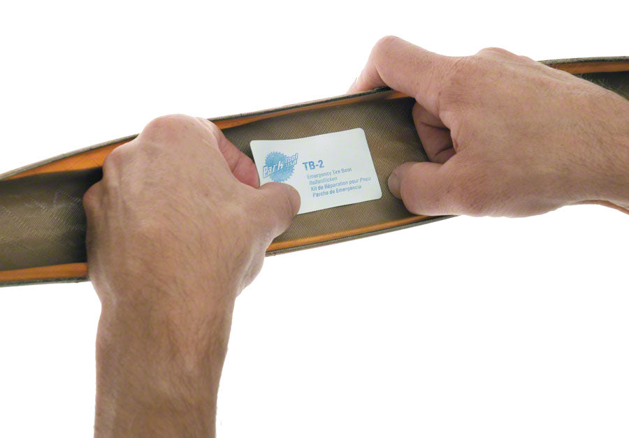 Park Tool Emergency Tire Boots Pack of 3. The TB-2 Tire Boot is constructed from a strong waterproof vinyl membrane with fiber weave reinforcement. A super-strong pressure-sensitive adhesive assures the boot stays in place in any bicycle tire that utilizes an inner tube whether road or mountain high or low pressure. Application is as easy as wiping the area clean removing the backing and squarely applying the tire boot to the affected area. A true ride saver.
