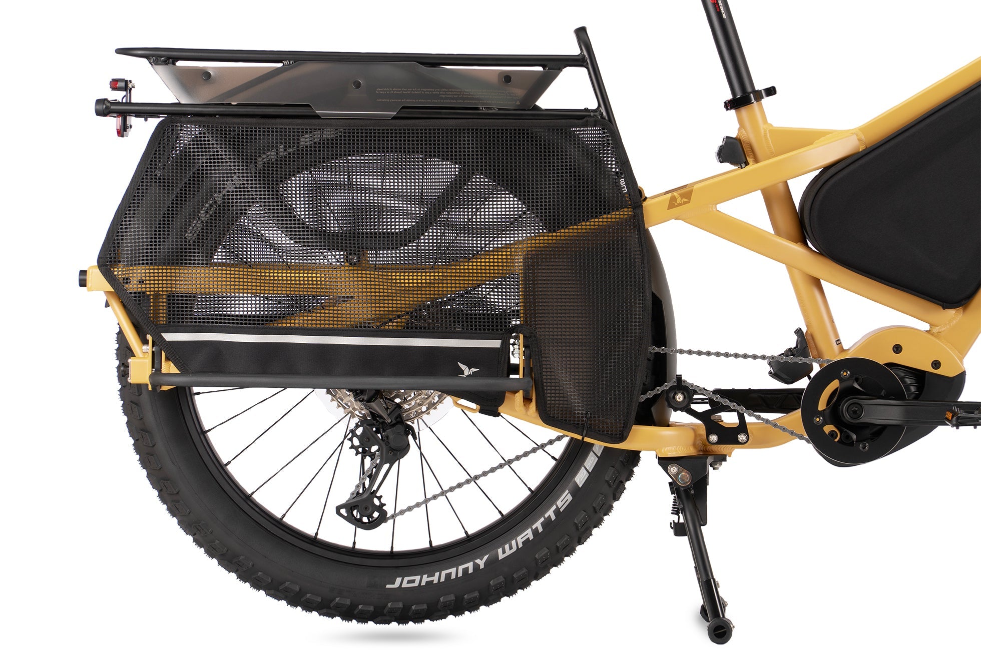 The Sidekick Wheel Guard XL is a pair of mesh wheel guards that protect passengers' feet and legs on the rear of the Orox adventure cargo bike. While the wheel guards are for young and old alike, they're necessary for kids in a child seat without built-in footrest panels, or when using any other passenger accessories.