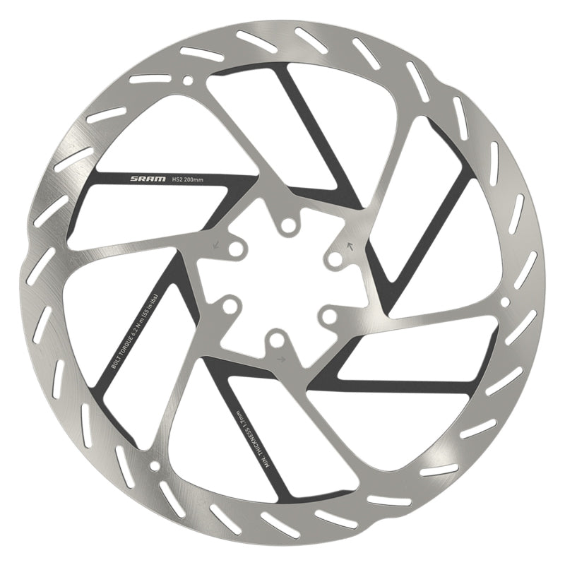 SRAM HS2 Disc Brake Rotor - 200mm 6-Bolt Rounded Silver/Black. The SRAM HS2 Rotor is a mountain bike specific rotor designed to improve brake performance while reducing noise and increasing heat dissipation. It features a brake track pattern for increased pad traction and recessed spokes with thermal dissipating paint the HS2 is a more powerful quieter rotor with best-in-class heat management.